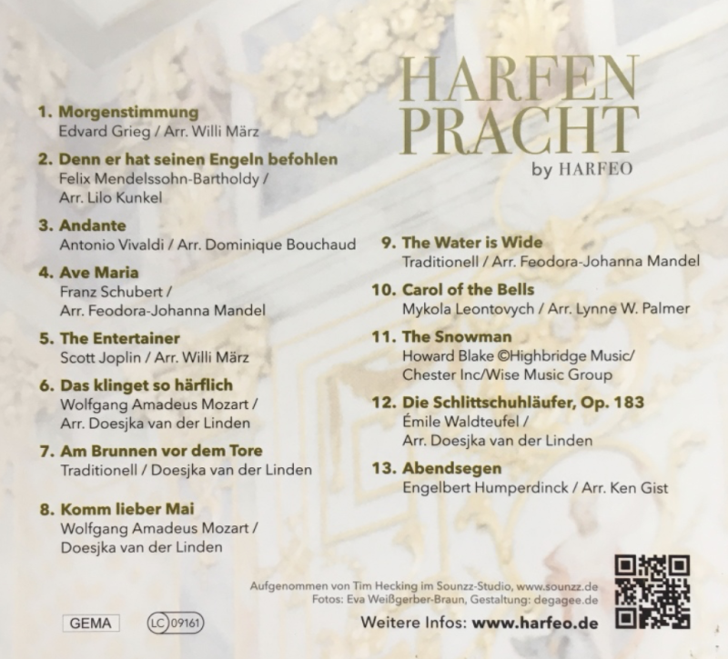 Das Repertoire unserer 'Harfenpracht'-CD besteht aus einer sehr abwechslungsreichen und wohltuenden Mischung von Musikstücken, die dafür prädestiniert sind, Sie durch das ganze Jahr hindurch zu begleiten. Sowohl frühlingshaft als auch weihnachtslich, passend zur Morgen- und Abendstimmung, nicht nur beruhigend und harmonisierend, sondern auch aufregend und erfrischend!