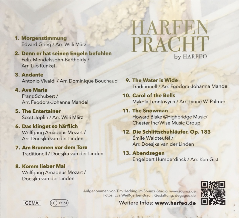 Das Repertoire unserer 'Harfenpracht'-CD besteht aus einer sehr abwechslungsreichen und wohltuenden Mischung von Musikstücken, die dafür prädestiniert sind, Sie durch das ganze Jahr hindurch zu begleiten. Sowohl frühlingshaft als auch weihnachtslich, passend zur Morgen- und Abendstimmung, nicht nur beruhigend und harmonisierend, sondern auch aufregend und erfrischend!